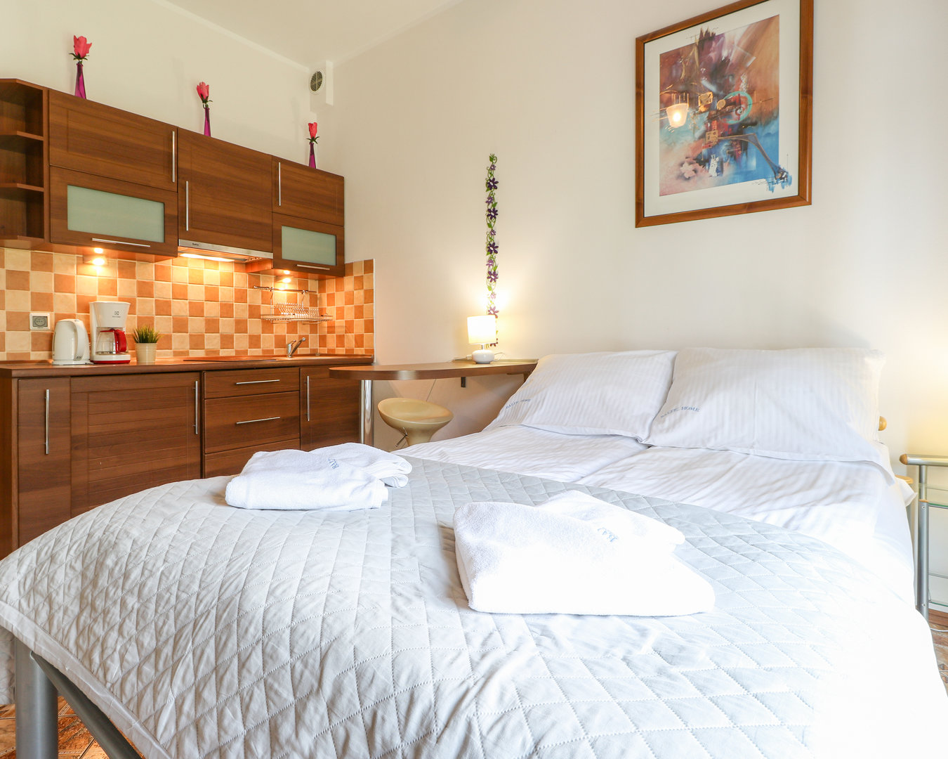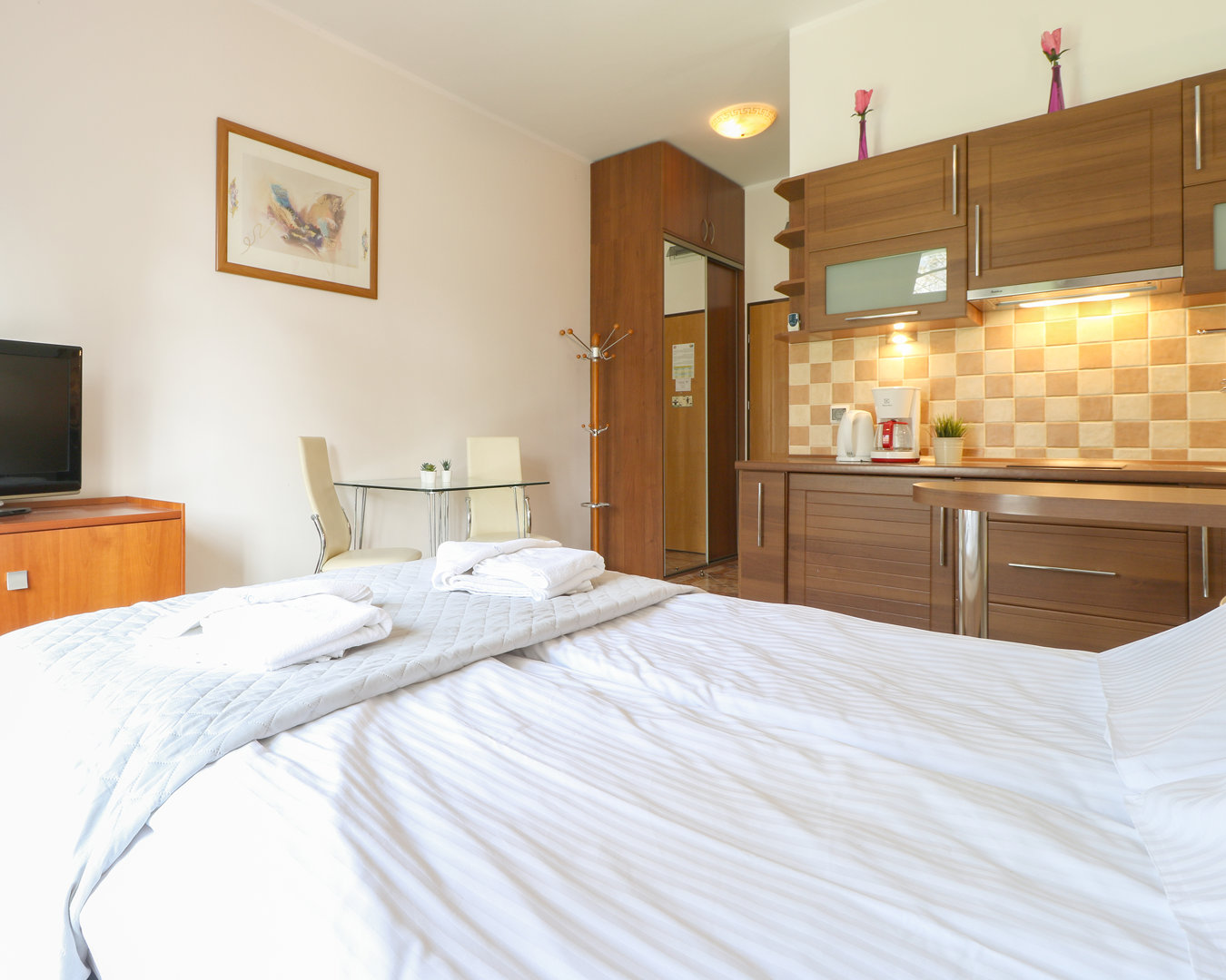 Das Apartment 08 Korona Wazów ist eine komfortable 22 m² große Unterkunft, ideal für Paare, im Erdgeschoss eines modernen Gebäudes. Vom Apartment führt eine Tür auf eine großzügige Terrasse, auf der man sich im Freien entspannen kann. Die Wohnung verfügt über eine Küchenzeile, einen Kühlschrank, eine Kaffeemaschine und einen Fernseher. Das Badezimmer ist mit einer Dusche ausgestattet. Die ausgezeichnete Lage in der Nähe des Strandes und der Promenade macht es zu einem idealen Ziel für einen romantischen Aufenthalt.