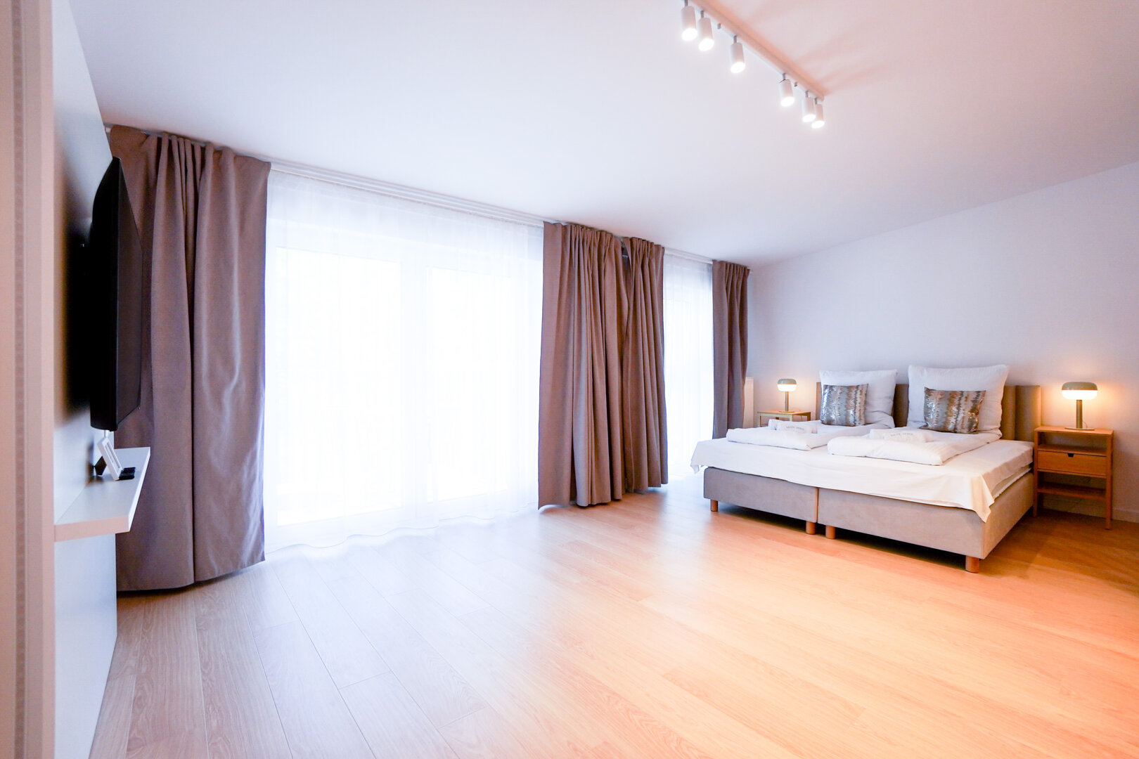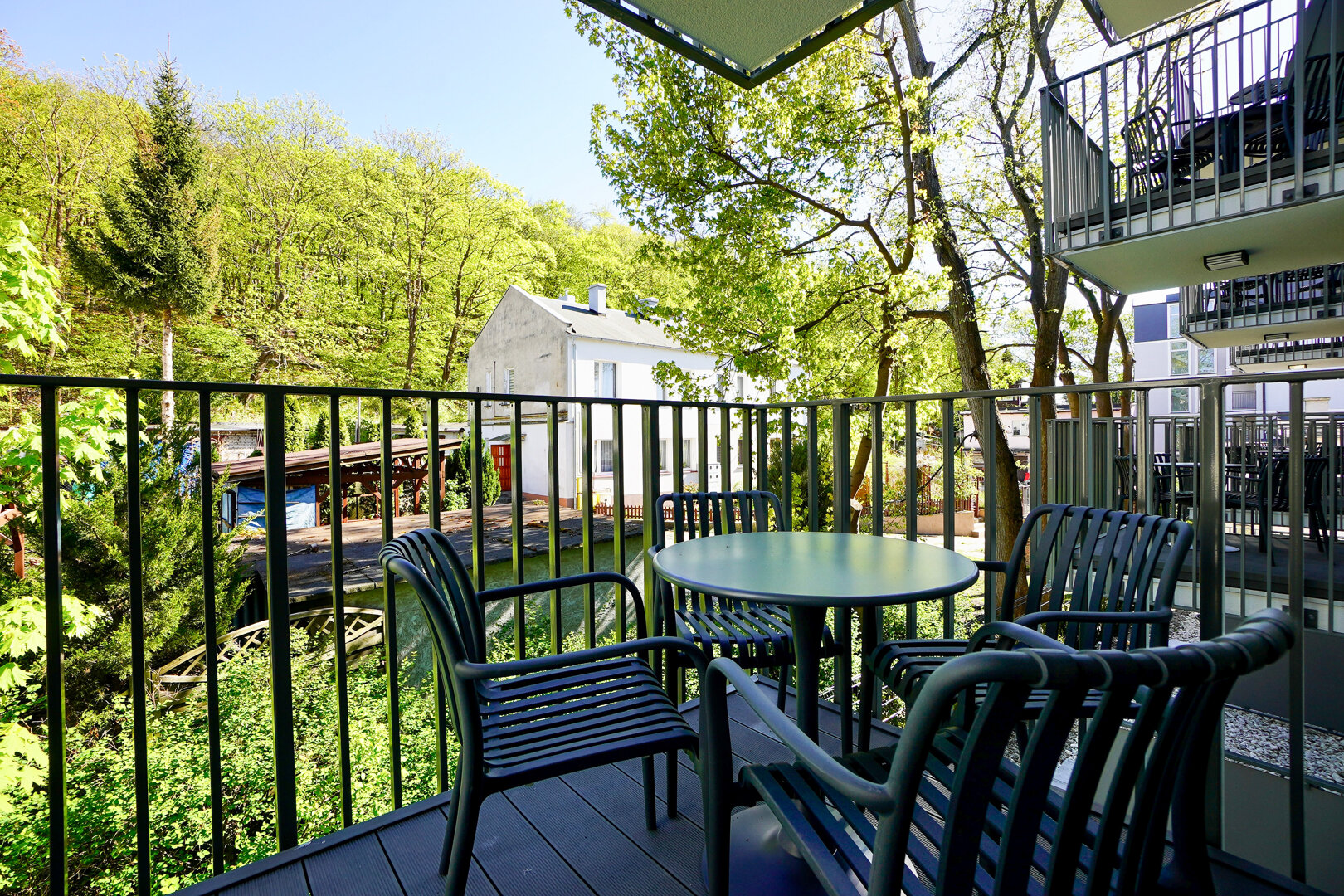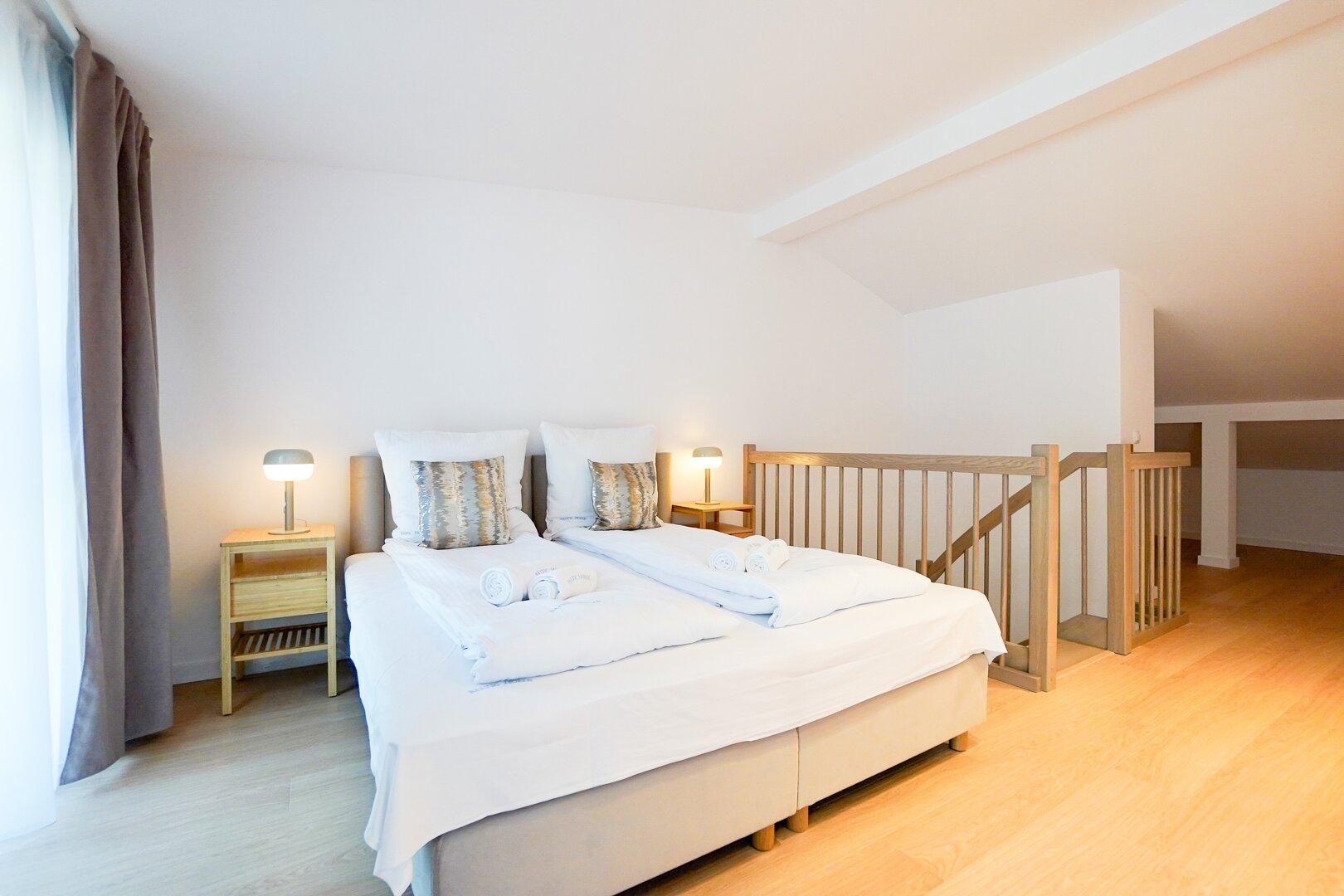 Das Apartment verfügt über ein Schlafzimmer, ein geräumiges Wohnzimmer mit Küchenzeile und eine stilvolle Galerie, die als zusätzlicher Wohn- oder Schlafbereich genutzt werden kann. Der große Balkon bietet eine wunderschöne Aussicht auf die grüne Landschaft, sanfte Hügel und die Tierwelt des Parks. Natürliche Materialien, Holzelemente und helle Farben schaffen eine harmonische und entspannte Atmosphäre.