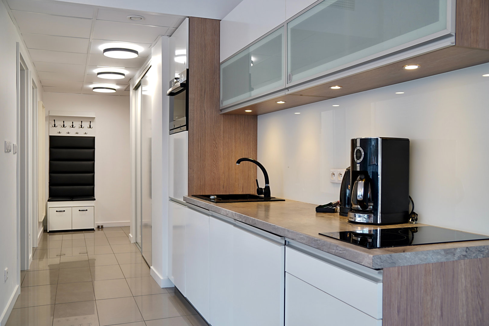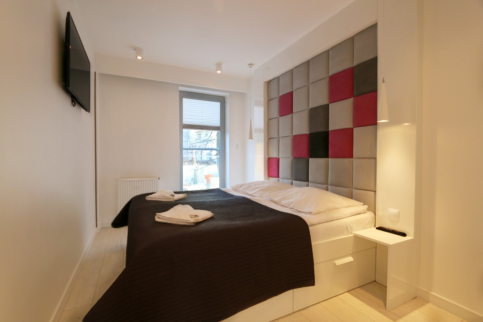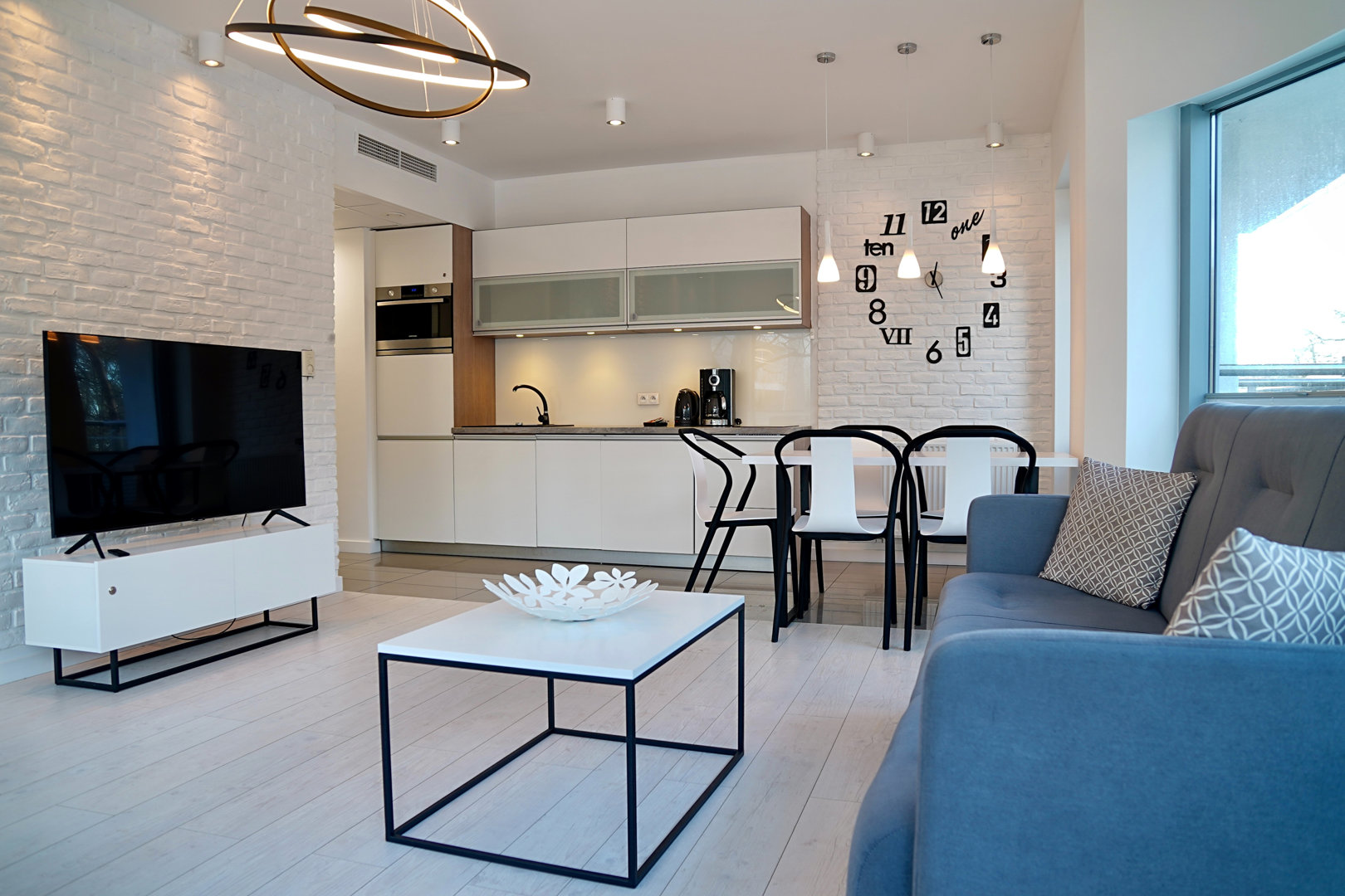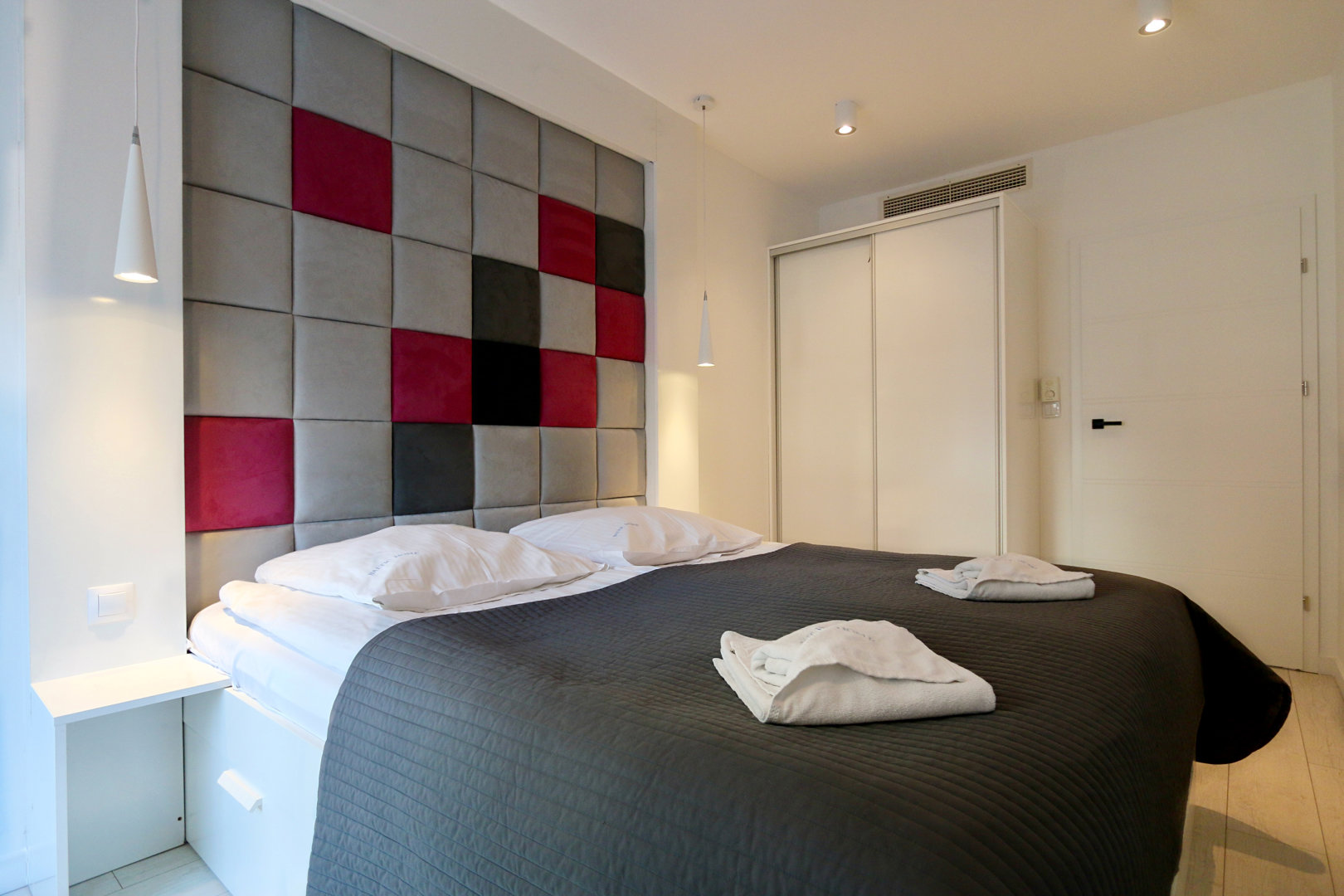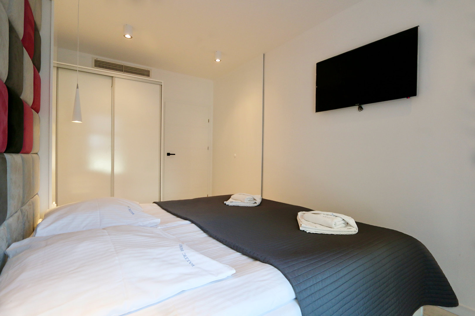 Zweizimmerwohnung für max. 5 Personen Eine gute Wahl für Menschen, die originelles Interieur und Dekor schätzen. Eine moderne Wohnung mit einer schönen, großen Glaskuppel. Den Gästen steht ein geräumiges Wohnzimmer zur Verfügung, das mit einer Küchenzeile verbunden ist. Im Wohnbereich befinden sich zwei bequeme Sofas mit Schlaffunktion, ein Couchtisch und ein großer Fernseher. Das Schlafzimmer verfügt über ein großes Doppelbett mit einem Kopfteil aus Samt. Ein zusätzlicher Vorteil ist, dass die Wohnung mit zwei TV-Geräten ausgestattet ist. Ein sehr geschmackvoll und praktisch eingerichtetes Badezimmer mit Dusche und großer Regendusche. Die Wohnung verfügt außerdem über einen Balkon, auf dem Sie in der Morgensonne entspannen können. Der Vorteil dieses Standorts ist die Möglichkeit, die Aussichtsplattform im obersten, zwölften Stockwerk zu nutzen. Den Gästen dieser Anlage steht außerdem eine kostenlose Sauna und in der Sommersaison ein Swimmingpool auf dem Dach mit Blick auf das Meer zur Verfügung.