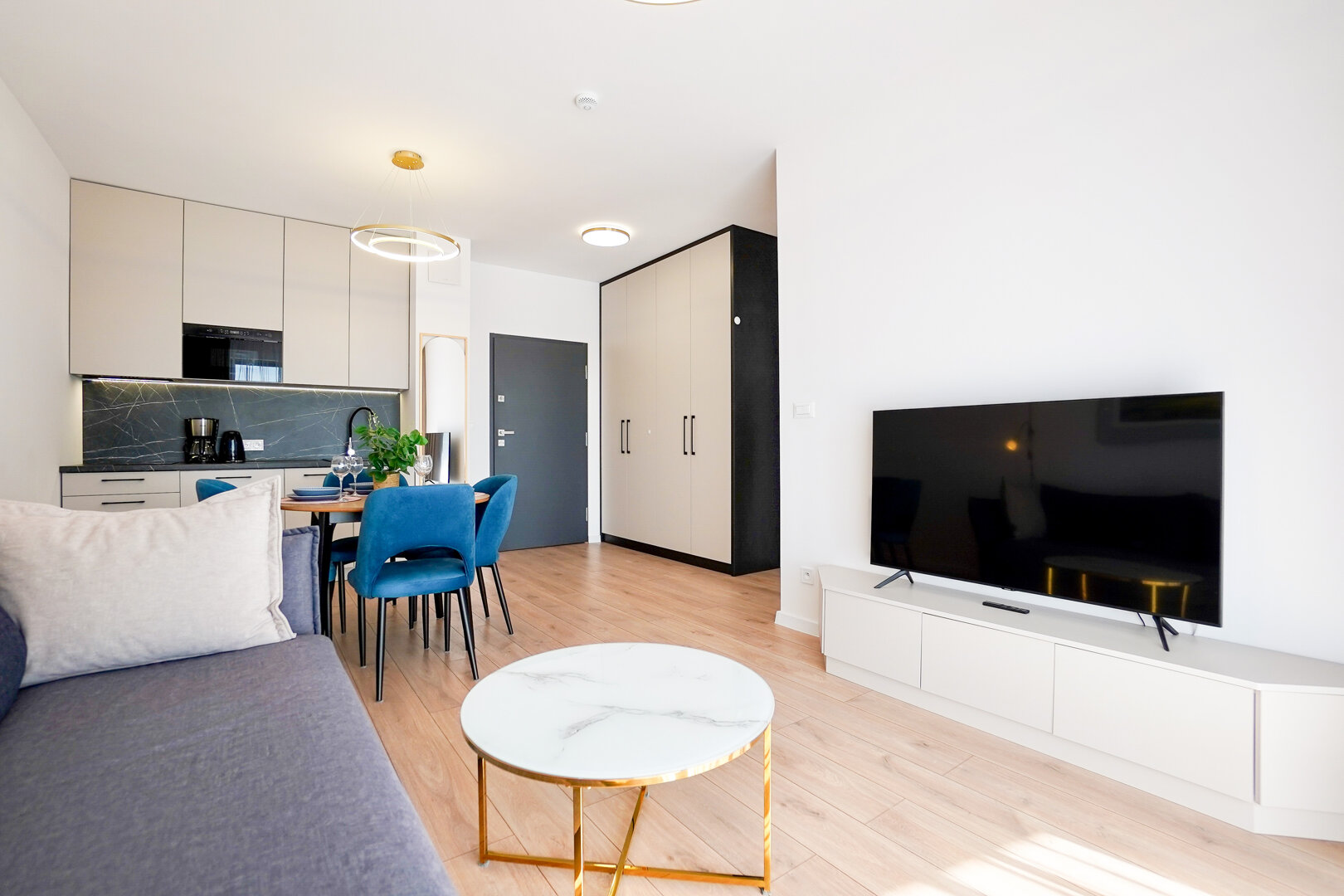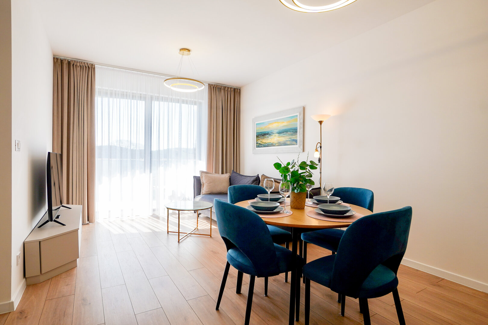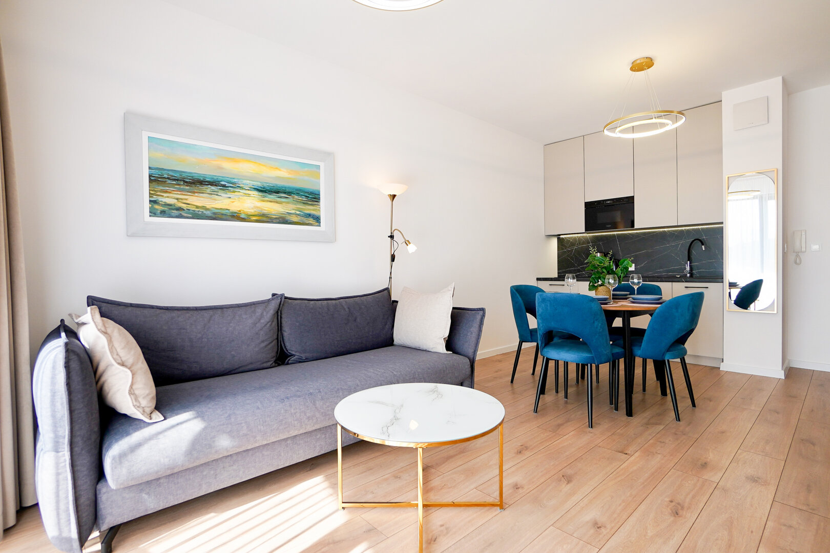 Das helle und funktionale Interieur umfasst ein Wohnzimmer mit ausziehbarem Sofa, ein Schlafzimmer mit Doppelbett und eine elegante Badezimmergestaltung. Die angenehme Farbgestaltung sorgt für eine gemütliche Atmosphäre.