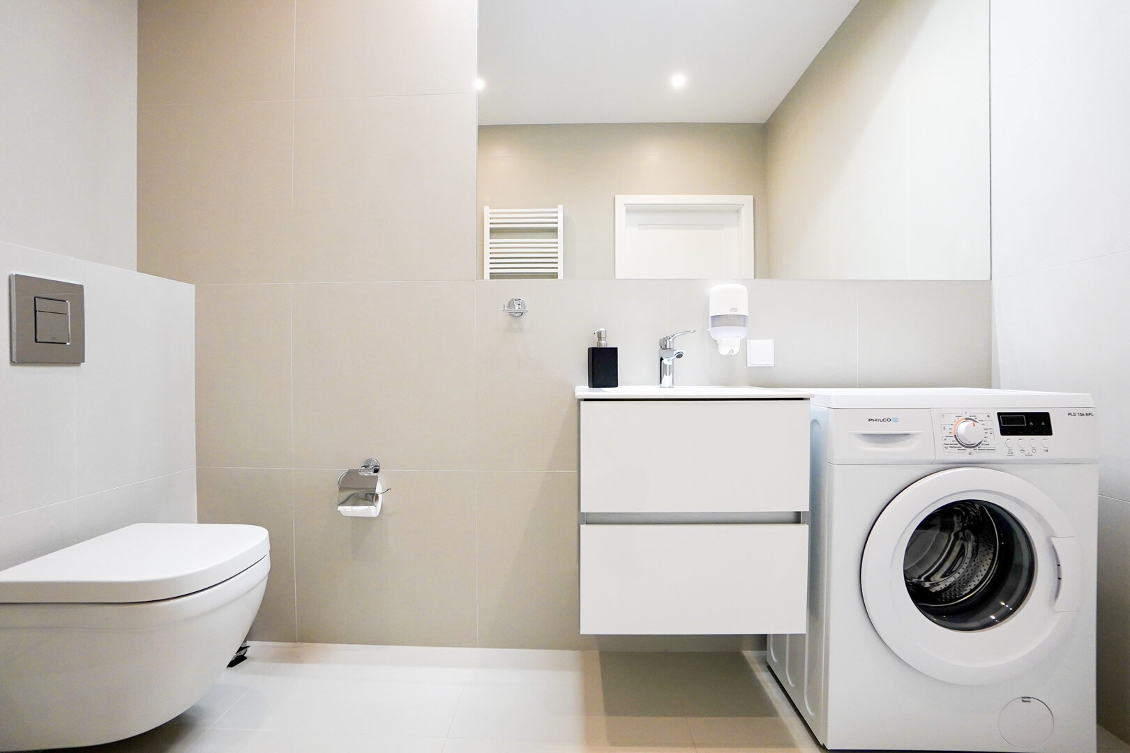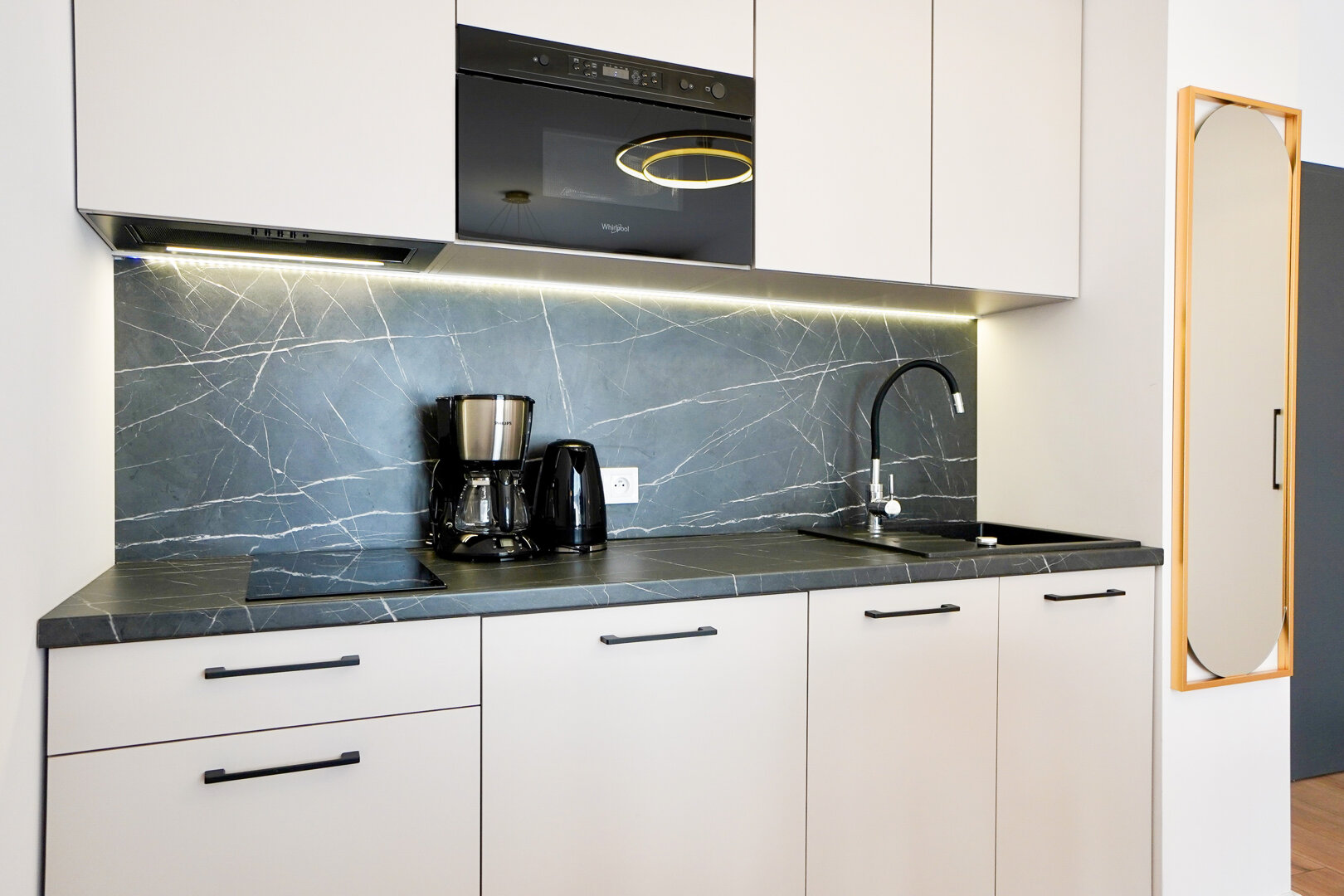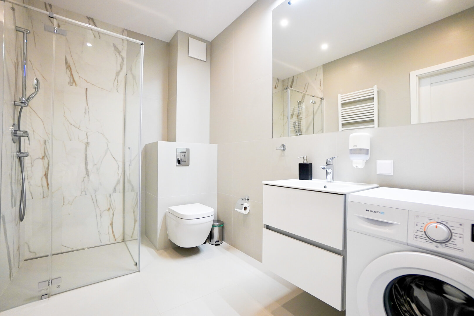 Das helle und funktionale Interieur umfasst ein Wohnzimmer mit ausziehbarem Sofa, ein Schlafzimmer mit Doppelbett und eine elegante Badezimmergestaltung. Die angenehme Farbgestaltung sorgt für eine gemütliche Atmosphäre.
