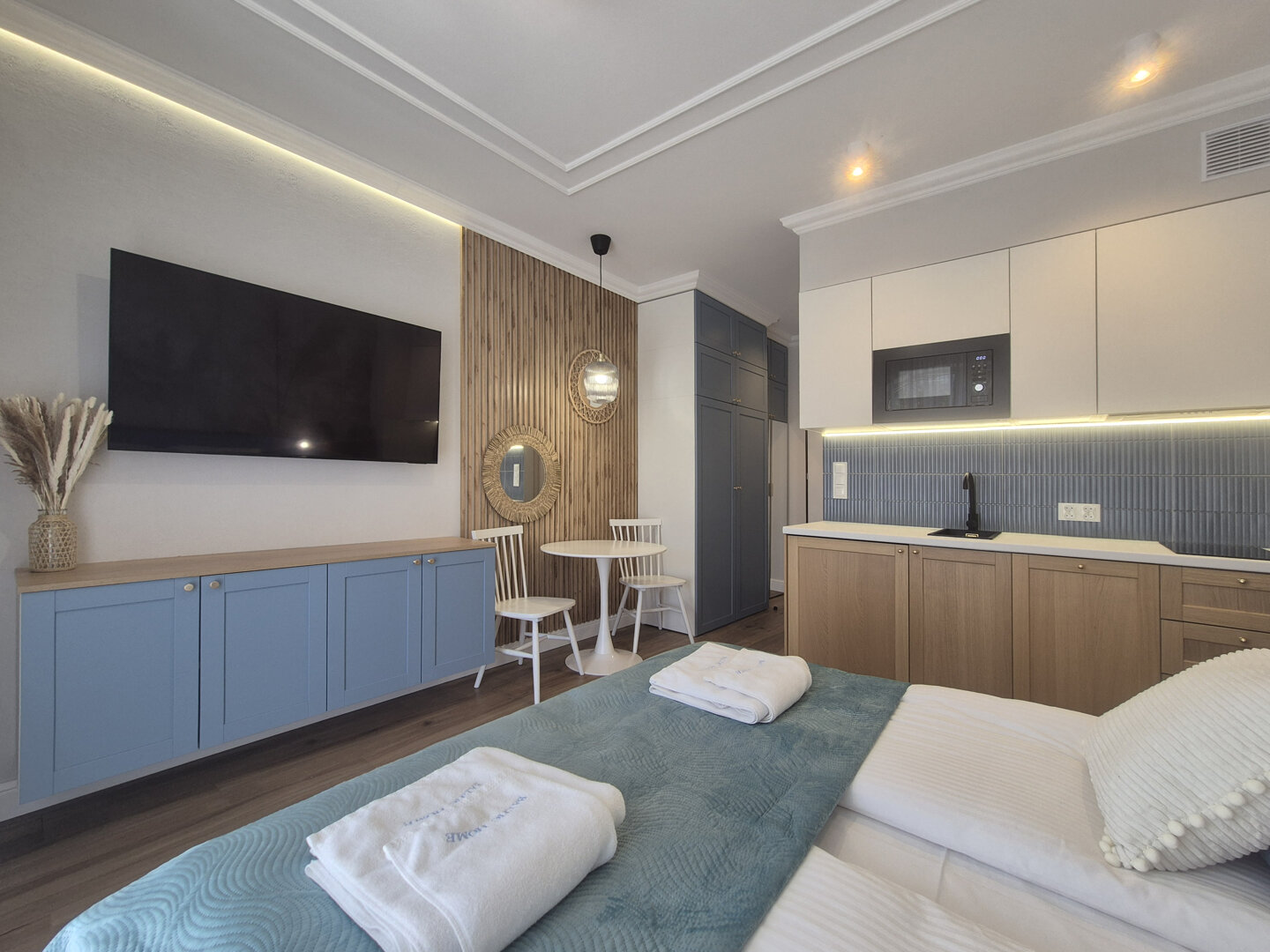 Komfortables Studio-Apartment mit gehobenem Standard im Gebäude Trzy Korony, direkt gegenüber der Strandpromenade in Świnoujście. Die Wohnung bietet eine funktionale Fläche mit Küchenzeile, Wohnbereich und Balkon. Helle Innenräume und moderne Ausstattung sorgen für einen angenehmen Aufenthalt. Ideal für Paare, die die Nähe zum Strand, Restaurants und Spazierwegen in ruhiger, maritimer Umgebung schätzen.