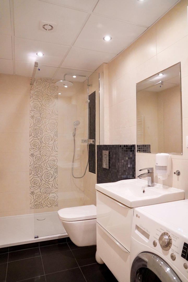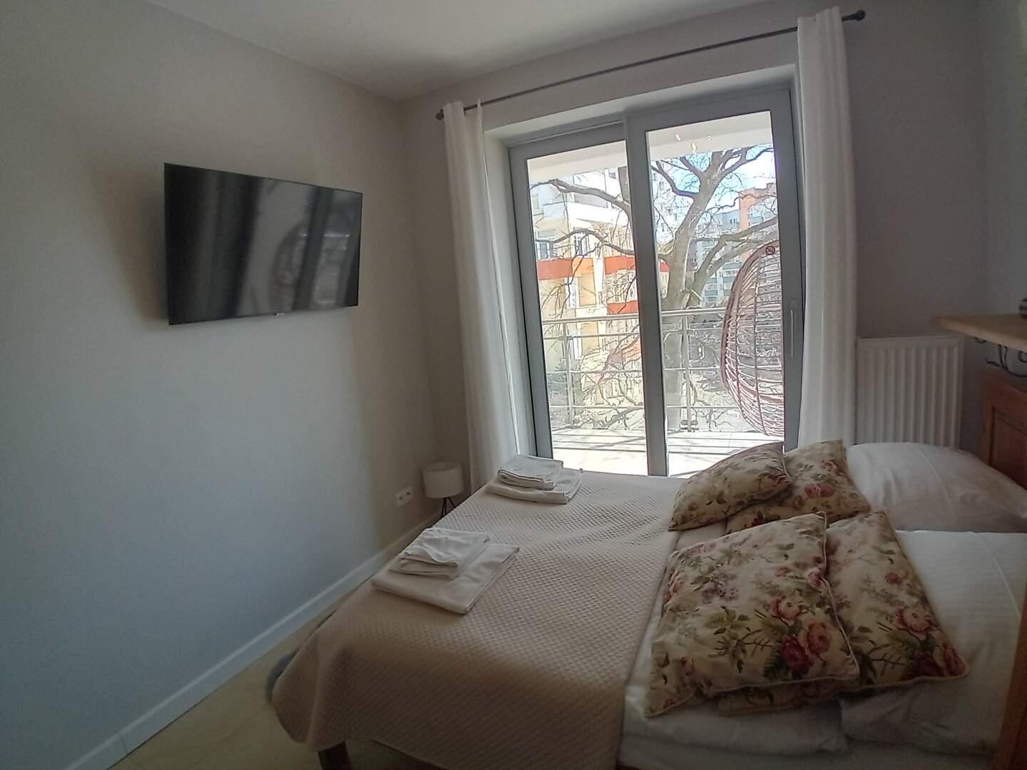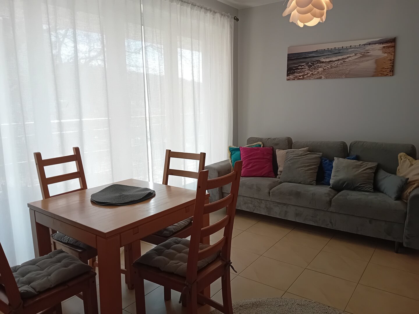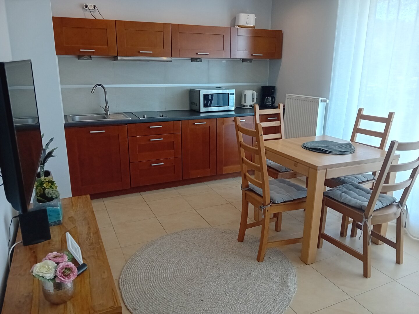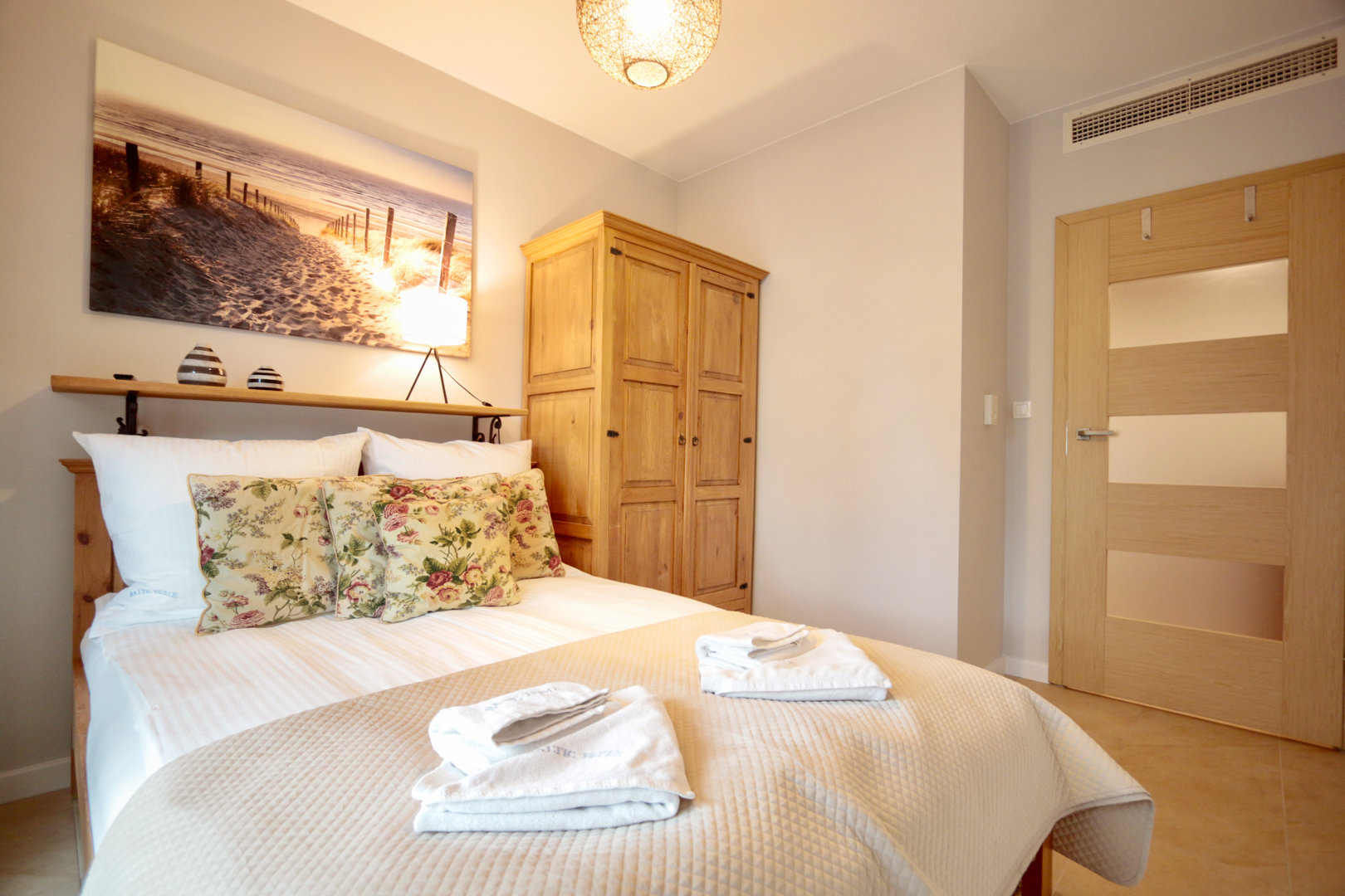 Eine geschmackvoll eingerichtete Wohnung mit einem gemütlichen Wohnzimmer mit Küchenzeile und einem separaten Schlafzimmer mit Doppelbett. Das Apartment ist mit Holzakzenten ausgestattet. Das Badezimmer ist zu einem hohen Standard mit einer großen Dusche ausgestattet. Außerdem ist eine Waschmaschine vorhanden, was längere Aufenthalte erleichtert. Ein sehr schönes Set Terrassenmöbel auf dem Balkon wird unsere Gäste zufriedenstellen und sie in der Morgensonne entspannen lassen.Der Vorteil dieser Lage ist die Aussichtsplattform im obersten Stockwerk mit einem wunderschönen Blick auf das Meer und einer kostenlosen Sauna und in der Sommersaison auch einem Swimmingpool.