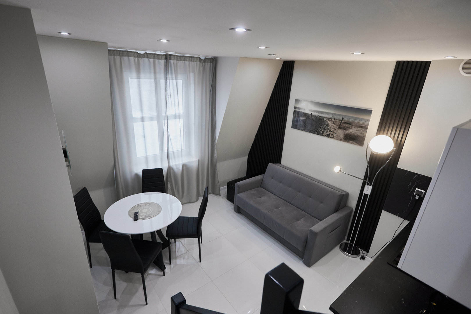 Das Apartment verfügt über eine voll ausgestattete Küchenzeile, die es den Gästen ermöglicht, eigene Mahlzeiten zuzubereiten. Das moderne Badezimmer ist mit Handtüchern ausgestattet, und das geräumige Wohnzimmer bietet einen komfortablen Raum zum Entspannen. Zwei gemütliche Schlafzimmer, die sich auf zwei Ebenen befinden, garantieren eine ruhige Nachtruhe und einen angenehmen Aufenthalt.