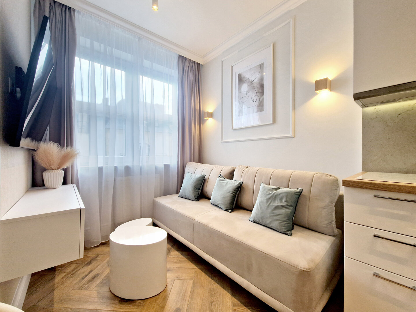 Das 44 Korona Jagiellonów Apartament befindet sich im 3. Stock und bietet 42 m² Wohnfläche. Es umfasst ein Wohnzimmer mit Küchenzeile, ein Badezimmer mit Dusche, ein Schlafzimmer mit Doppelbett und einer zusätzlichen Schlafcouch sowie eine separate Toilette. Zur Ausstattung gehören Klimaanlage, Waschmaschine, Geschirrspüler und moderne Küchengeräte.