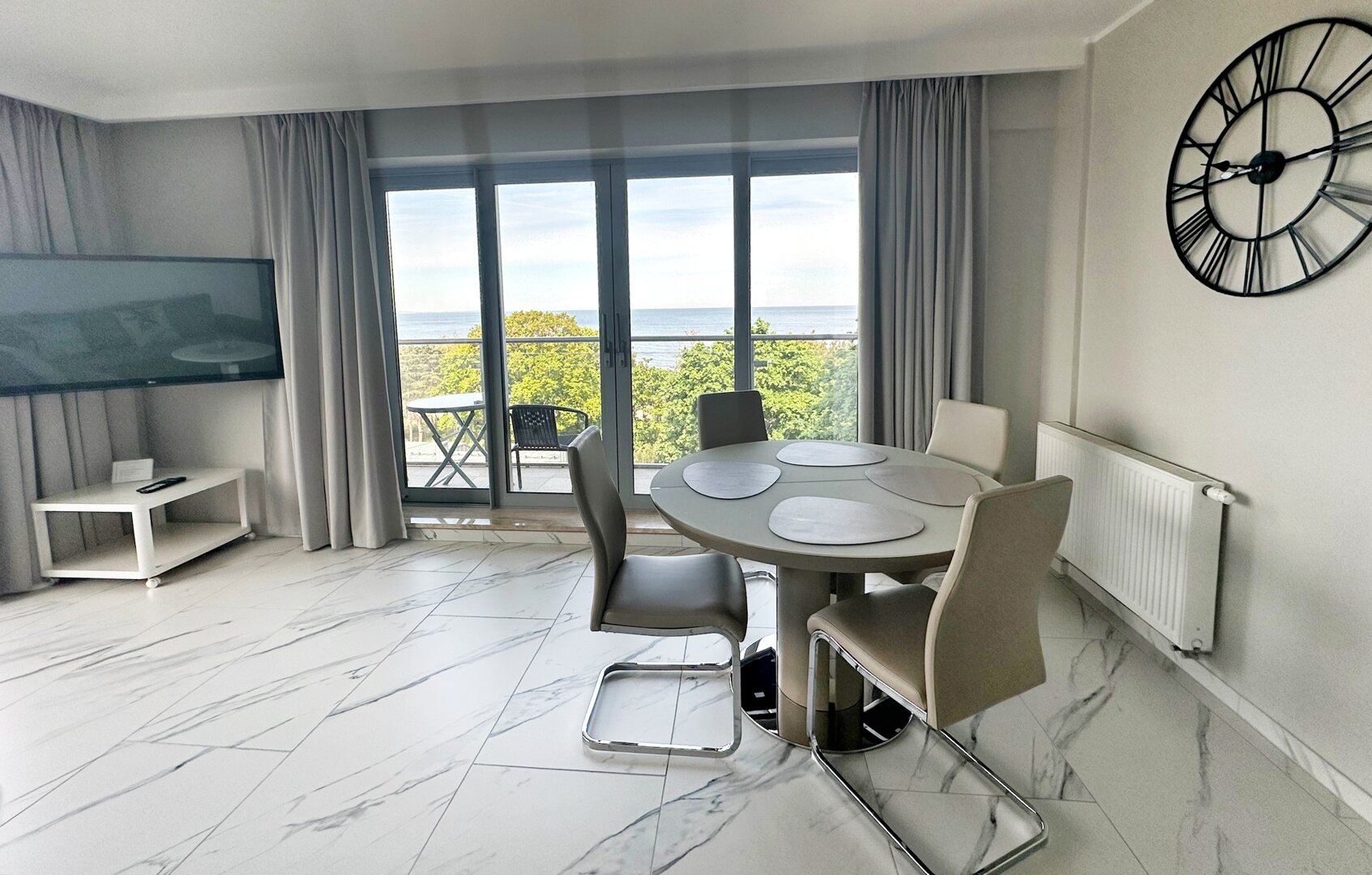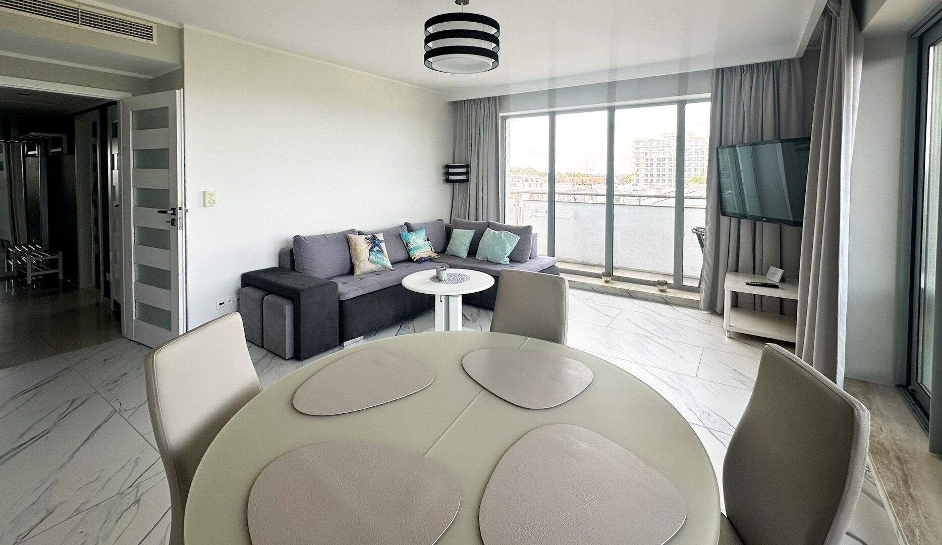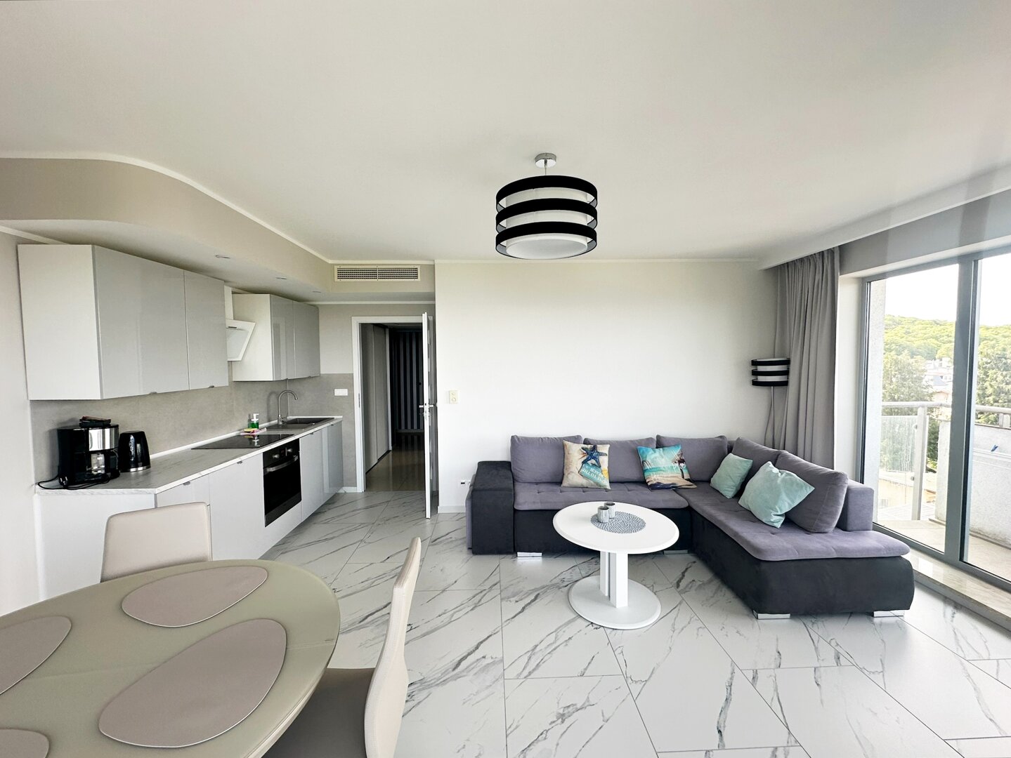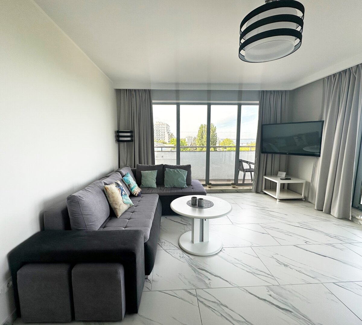Der Vorteil der Wohnung ist der direkte Meerblick und die Lage. Die Räumlichkeiten liegen direkt an der Promenade, etwa 100 Meter vom Strand entfernt. Die Wohnung befindet sich in einem Gebäude, in dessen oberster Etage sich eine Aussichtsplattform, ein Außenpool (in der Sommersaison geöffnet) und eine Sauna befinden.