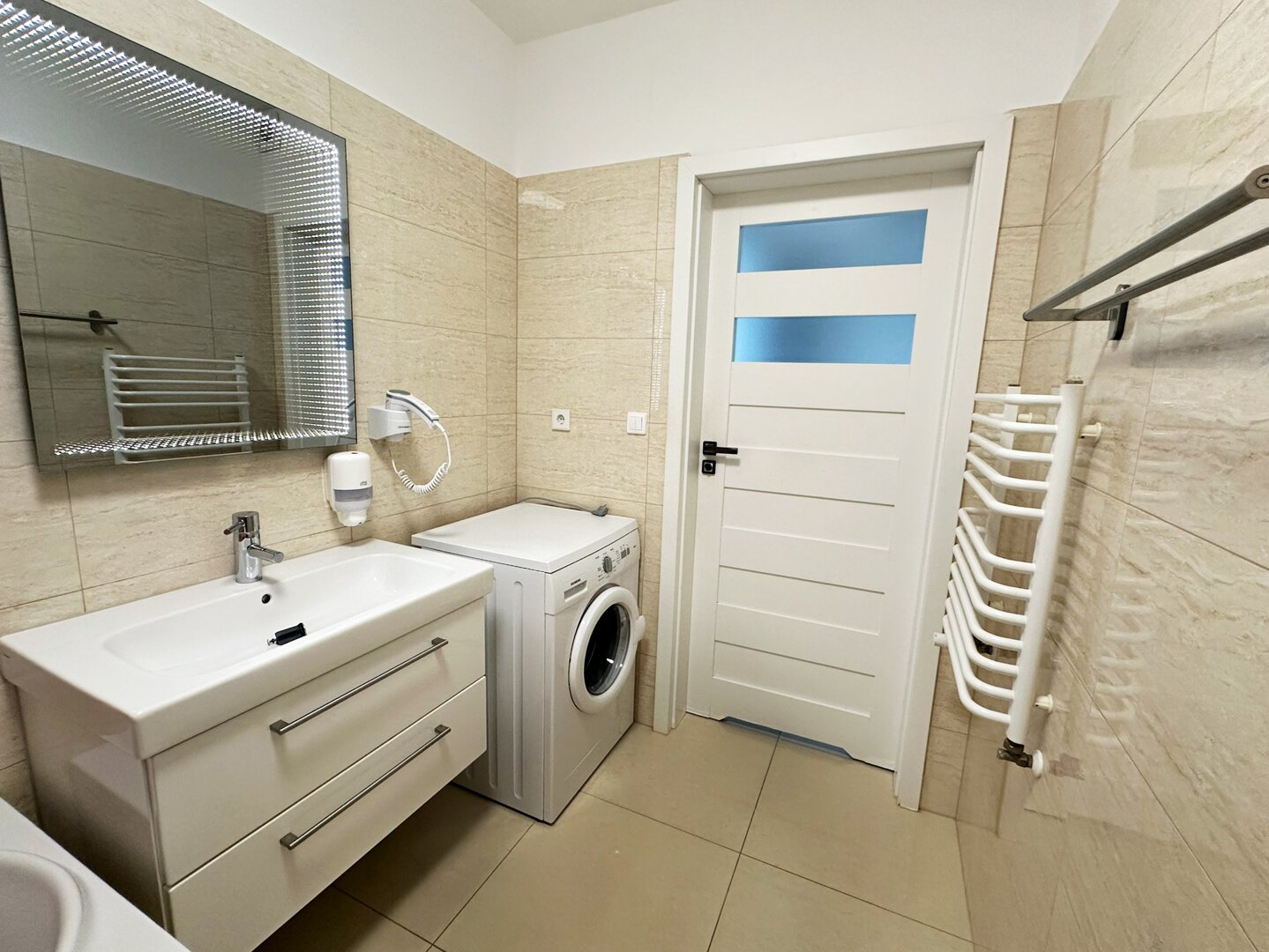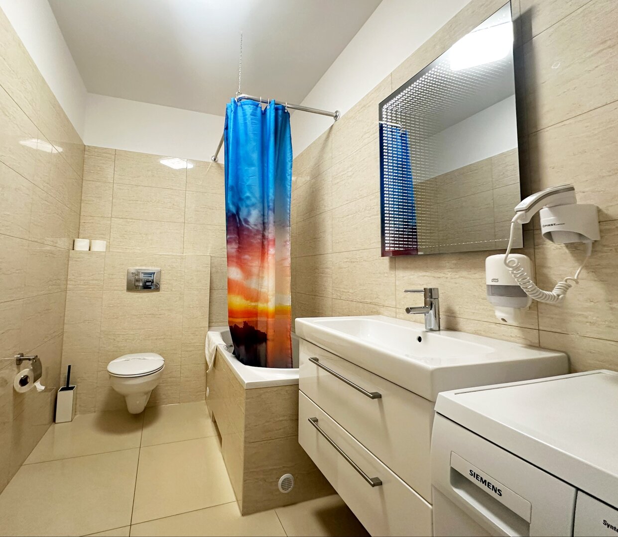 * Badezimmer mit Badewanne und Waschmaschine