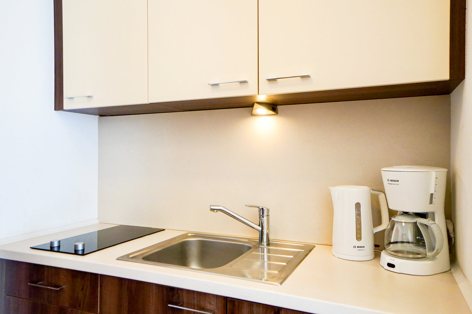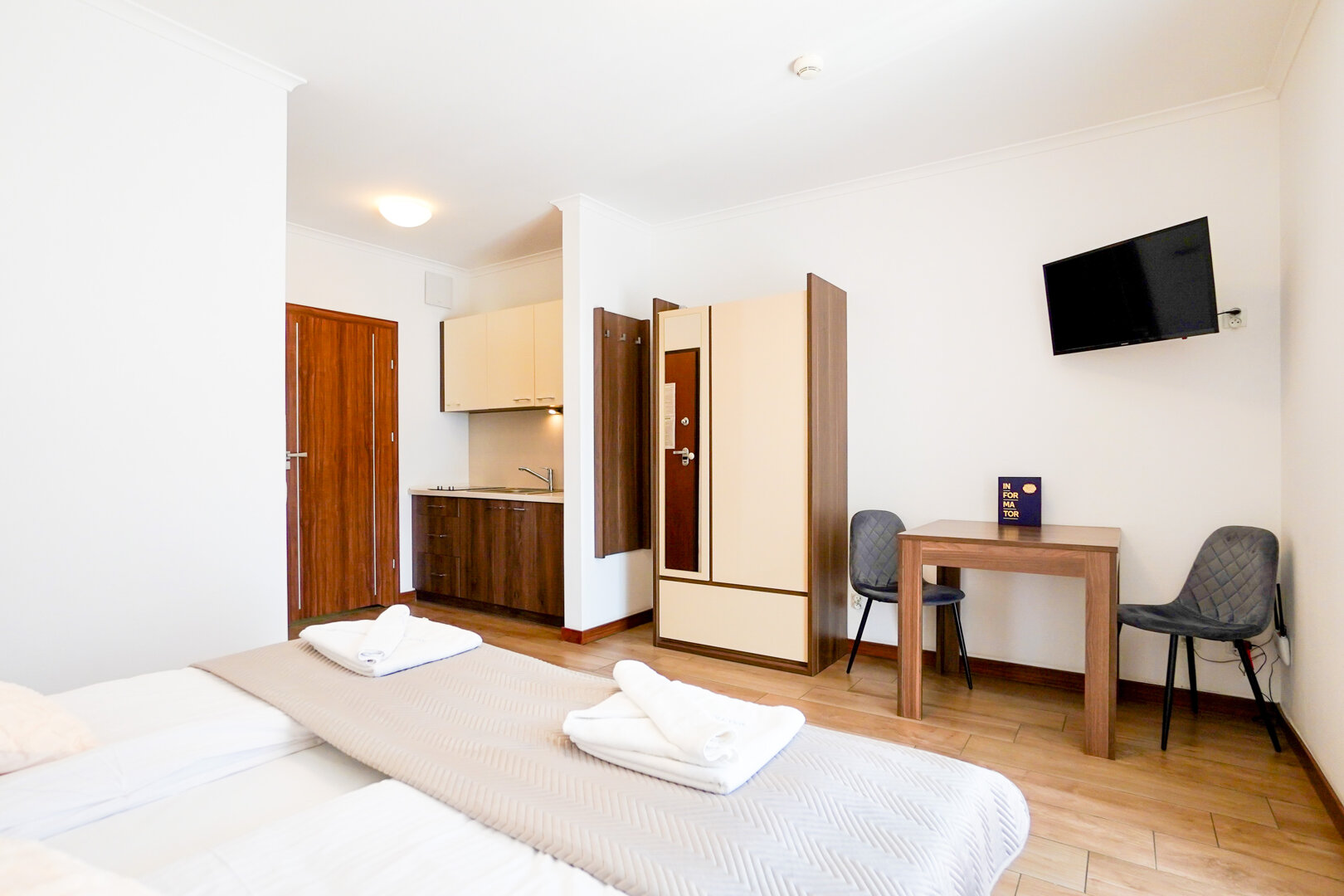 Der offene Grundriss verbindet Wohnbereich, Küchenzeile und Zugang zum privaten Balkon – perfekt für den Morgenkaffee oder entspannte Abende. Die Küchenzeile ist mit allem Notwendigen ausgestattet: Kochfeld, Mikrowelle, Kühlschrank, Wasserkocher und Kaffeemaschine. Den Gästen stehen außerdem kostenloses WLAN, ein Fernseher sowie – je nach Einheit – eine Waschmaschine und weitere Annehmlichkeiten zur Verfügung.